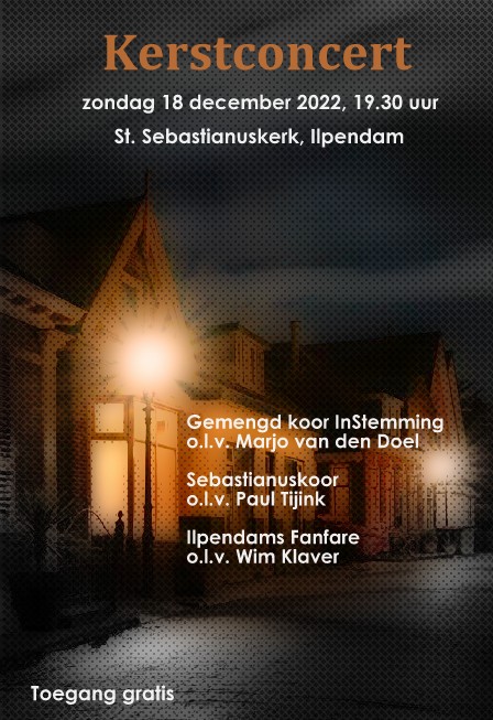 Om alvast in de kerstsfeer te komen, wordt u uitgenodigd bij het jaarlijkse Kerstconcert. De uitvoerenden zijn een samenwerkingsverband tussen Ilpendams Fanfare, het Sebastianuskoor en Gemengd koor InStemming. Allen uit Ilpendam. Na een pauze door corona hopen we u dit jaar weer allen te mogen verwelkomen. De toegang is gratis.