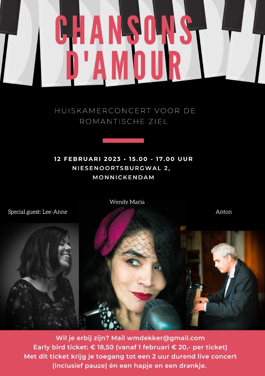 Een artistieke en gezellige middag met de mooiste Franse en Nederlandse chansons in de piano studio te Monnickendam, onder genot van een wijntje en een hapje.Chansons d `Anton & Wendy.
