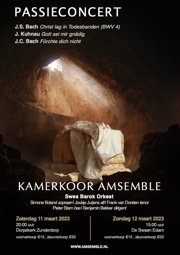 In het nieuwe Passieprogramma van Amsemble staat de cantate ‘Christ lag in Todesbanden’ (BWV 4) van J.S. Bach centraal. Bach schreef deze cantate waarschijnlijk ter gelegenheid van zijn auditie voor de post van organist aan de Blasiuskerk te Mülhausen in 1707. Het is zijn oudst bewaard gebleven cantate waarin Bach nog duidelijk voortborduurt op de stijl van Buxtehude, Pachelbel en Kuhnau. Johann Kuhnau was een voorganger van Bach als Thomascantor in Leipzig. Amsemble zingt van Kuhnau de cantate ‘Gott, sei mir gnädig’. Een prachtige cantate waarin Kuhnau een subtiele en verfijnde stijl laat horen die doet denken aan cantates van Buxtehude. Het programma wordt omsloten door twee motetten van Johann Christoph Bach.