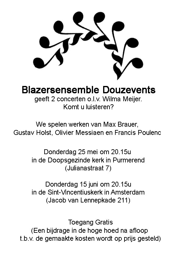Concert van dubbelkwintet (2 dwarsfluiten, 2 hobo's, 2 klarinetten, 2 hoorns en 2 fagotten). Er worden werken gespeeld van Max Brauer, Gustav Holst, Olivier Messiaen en Francis Poulenc. Tijdsduur is maximaal 1 uur en een kwartier. Dit is inclusief een korte pauze.