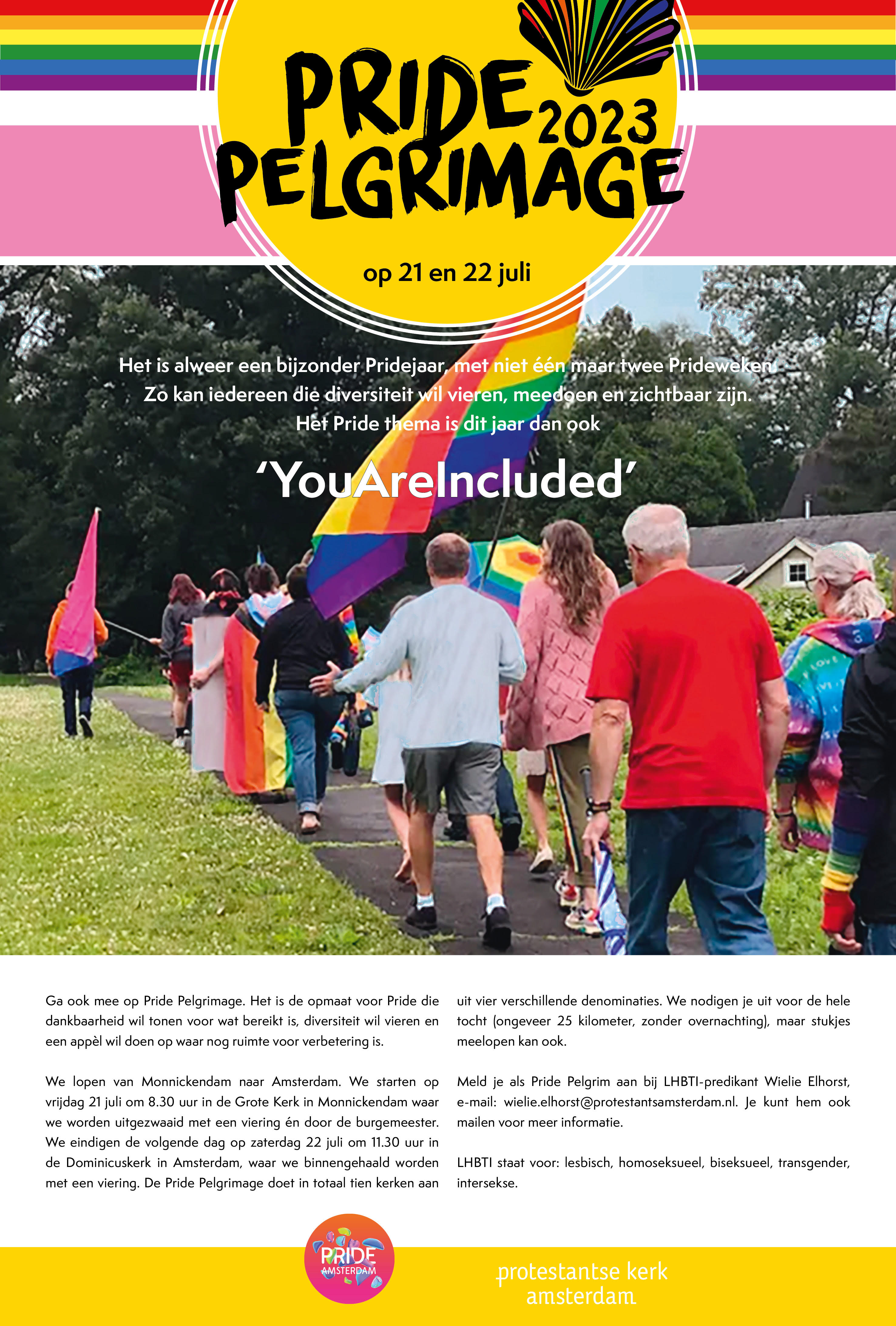 De Pride Pelgrimage is hét begin van Pride Amsterdam. Deze wandeltocht langs tien verschillende kerken, van de Grote Kerk in Monnickendam tot de Dominicus in Amsterdam, wil uitdrukking geven aan dankbaarheid voor alle positieve veranderingen in de kerken in de afgelopen decennia en de groeiende inclusiviteit voor LHBTI-personen vieren. Daarnaast beoogt de wandeltocht een appèl te doen op die kerken en geloofsgemeenschappen waar nog veel moet gebeuren om LHBTI-mensen zich meer thuis te laten voelen. Kerken doen graag mee aan de Pride Pelgrimage. Als pleisterplaats op de route doen zij hun deuren open voor de Pride Pelgrims. In elk kerk wordt even gepauzeerd én gevierd: een korte dienst rond het boek Ruth die ooit ook op weg ging, met haar schoonmoeder Naomi.