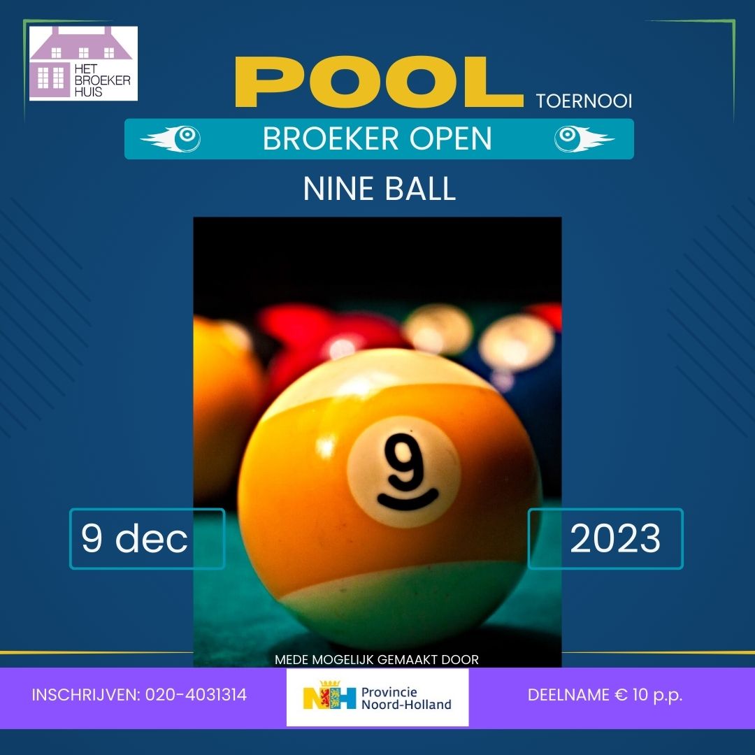 Zaterdag 9 december organiseert Het Broeker Huis Pooltoernooi Broeker Open!Er wordt 9-ball gespeeld: lekker snel en weinig ruimte voor discussie...Aanvang 16 uur, inschrijfgeld € 10,-Hapje eten tussendoor kan à € 12,50 Aanmelden: 020-4031314