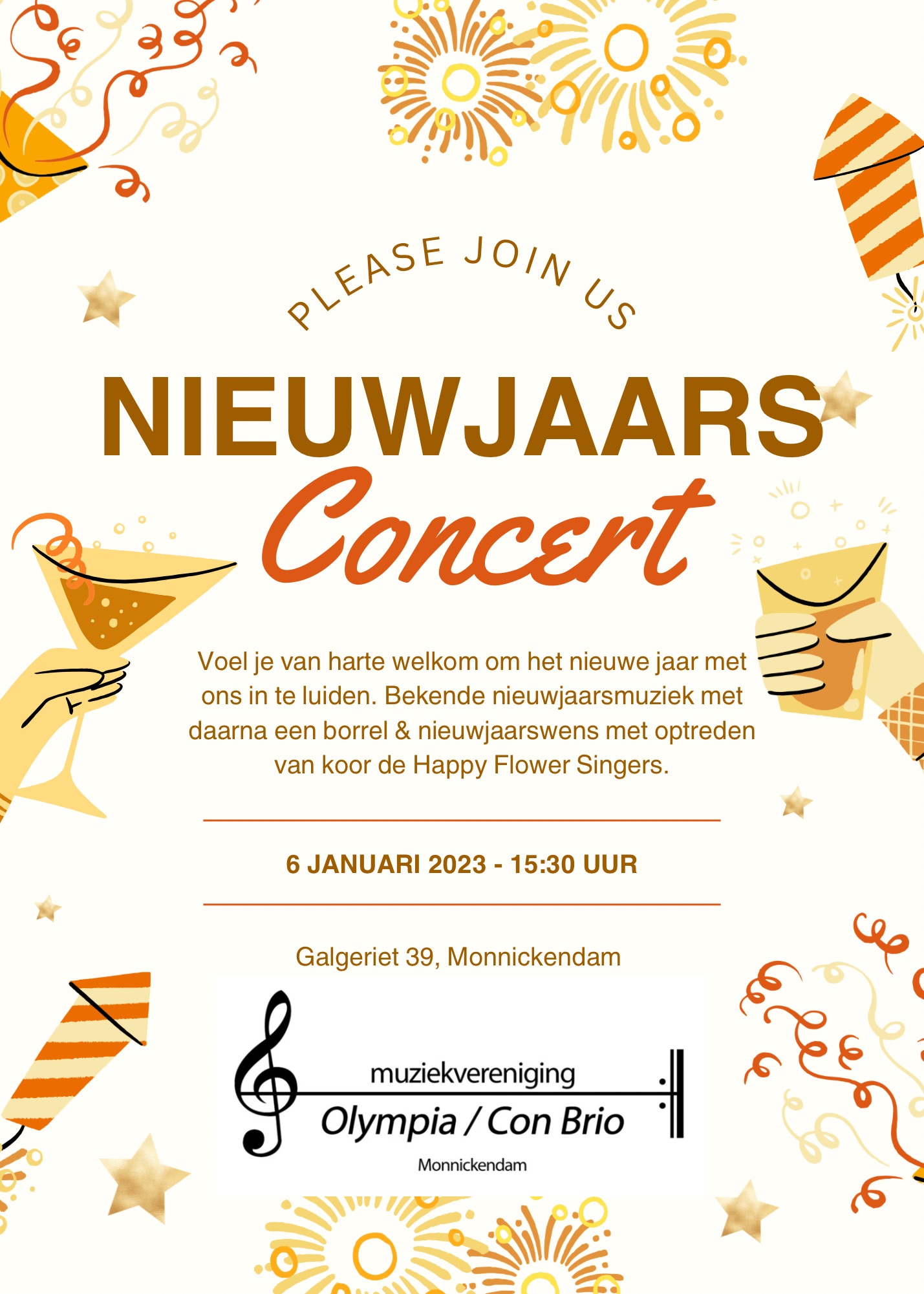 6 januari geven we ons jaarlijkse nieuwjaarsconcert. In eigen gebouw, met feestelijke verlichting en ongedwongen sfeer op Galgeriet 39 in Monnickendam.