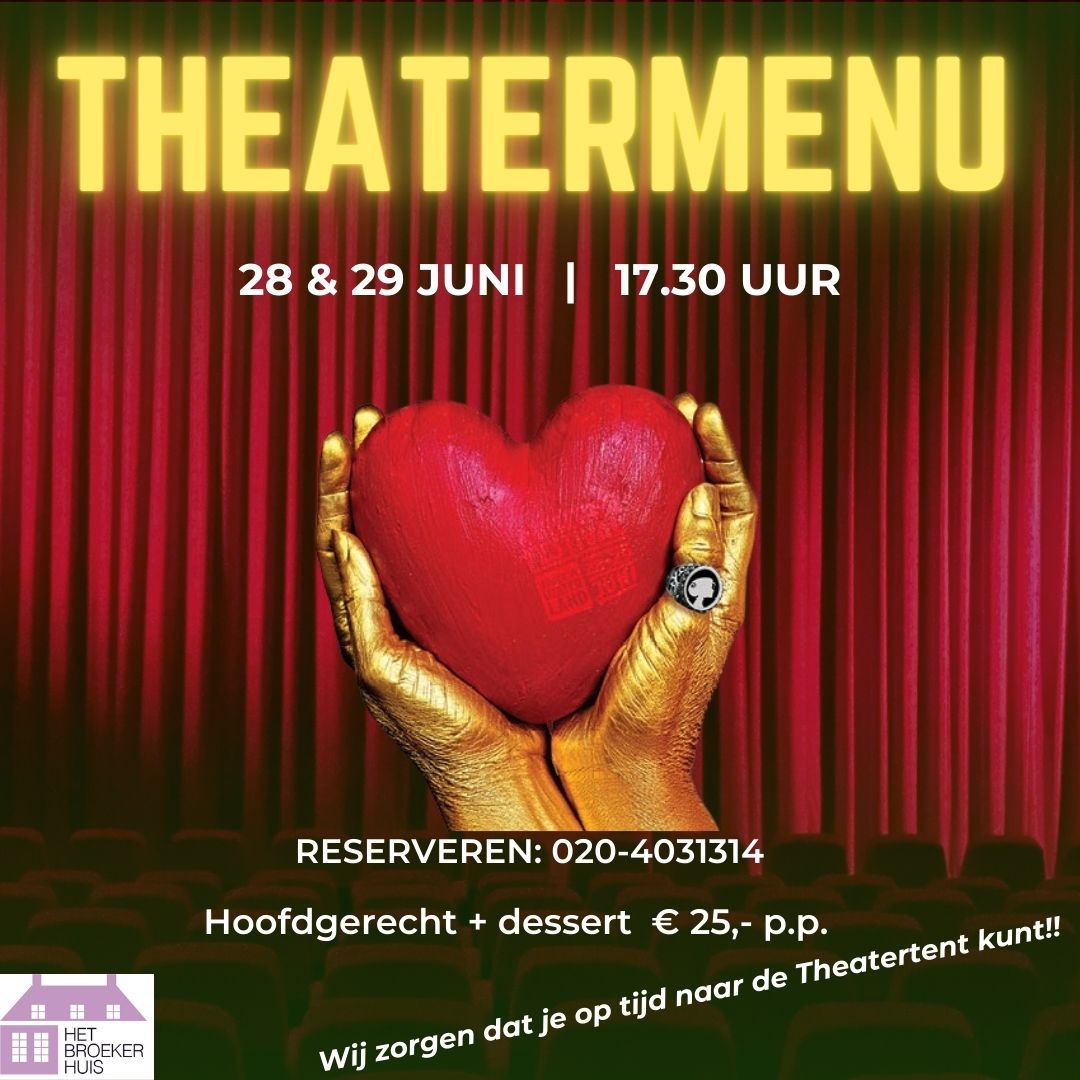 Een heerlijk hoofdgerecht (met uiteraard een vegetarische optie) plus een dessert voor 25 euro's. En dan sturen we je ook nog op tijd richting Theatertent zodat je niets hoeft te missen..! Vanaf 17 uur ben je welkom.
