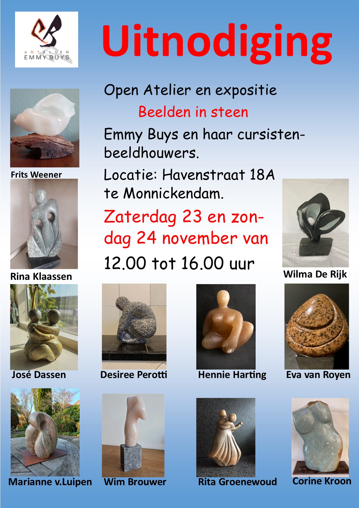 Najaarsexpositie beeldhouwer Emmy Buys en haar cursisten-beeldhouwers in Atelier Havenstraat 18a te Monnickendam op zaterdag 23 en zondag 24 november 2024 van 12.00 tot 16.00 uur.