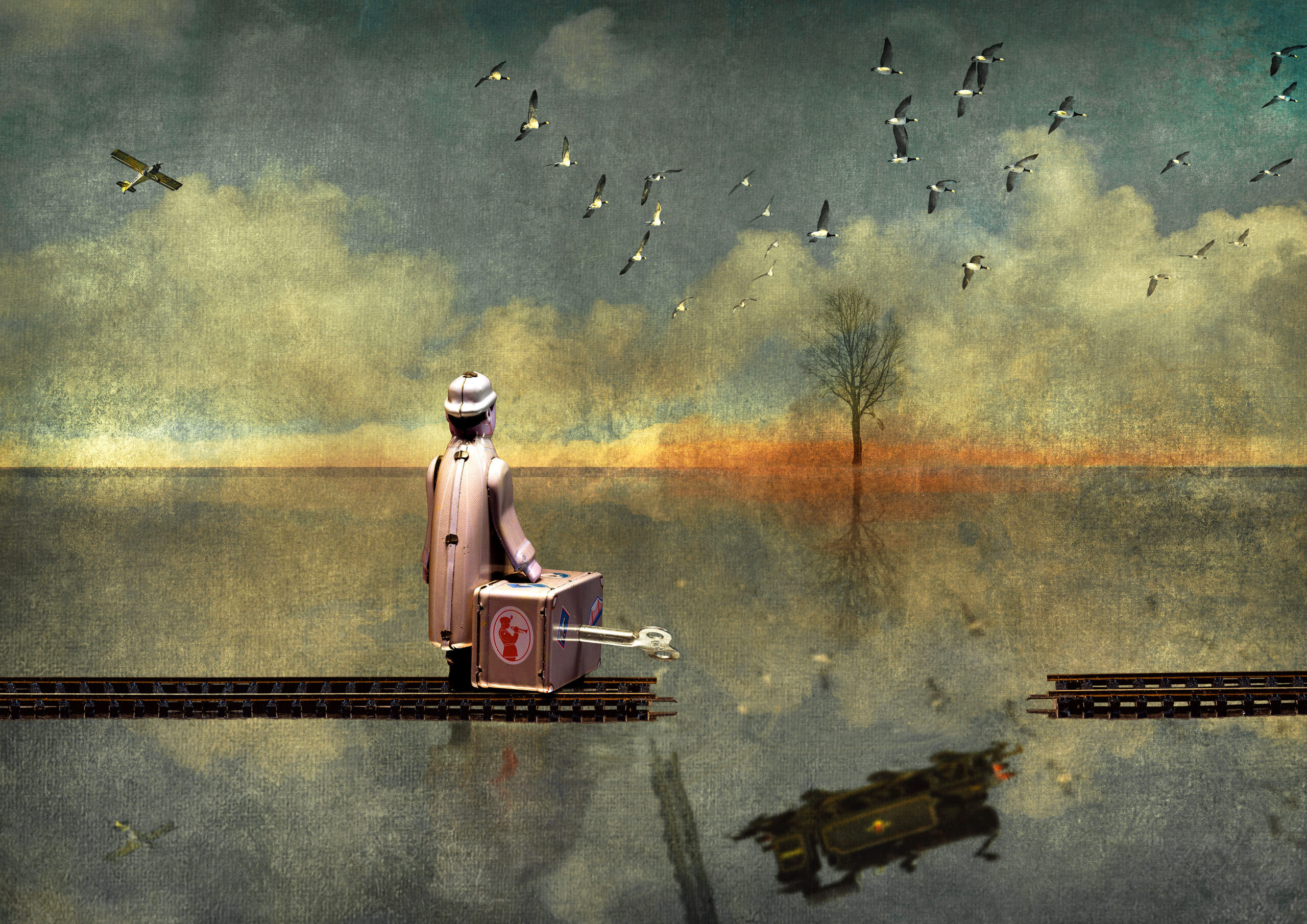 Deze fotoserie ontstond in 2021 bij toeval door een samengaan van aanhoudende Corona-isolatie, een dagelijkse wandeling en een vergeten speelgoedmannetje. Ik combineerde mijn foto’s van Waterland met close-ups van objecten in huis en gaf dit alles een schilderachtige textuur. Via fotomontages en vele, langdurige bewerkingen zijn de foto’s die ik maakte in Waterland op een andere, gefantaseerde manier gebruikt als achtergrond voor het speelgoed-mannetje – ‘de reiziger’- dat ik in 2010 in Hotel NY in Rotterdam kocht.