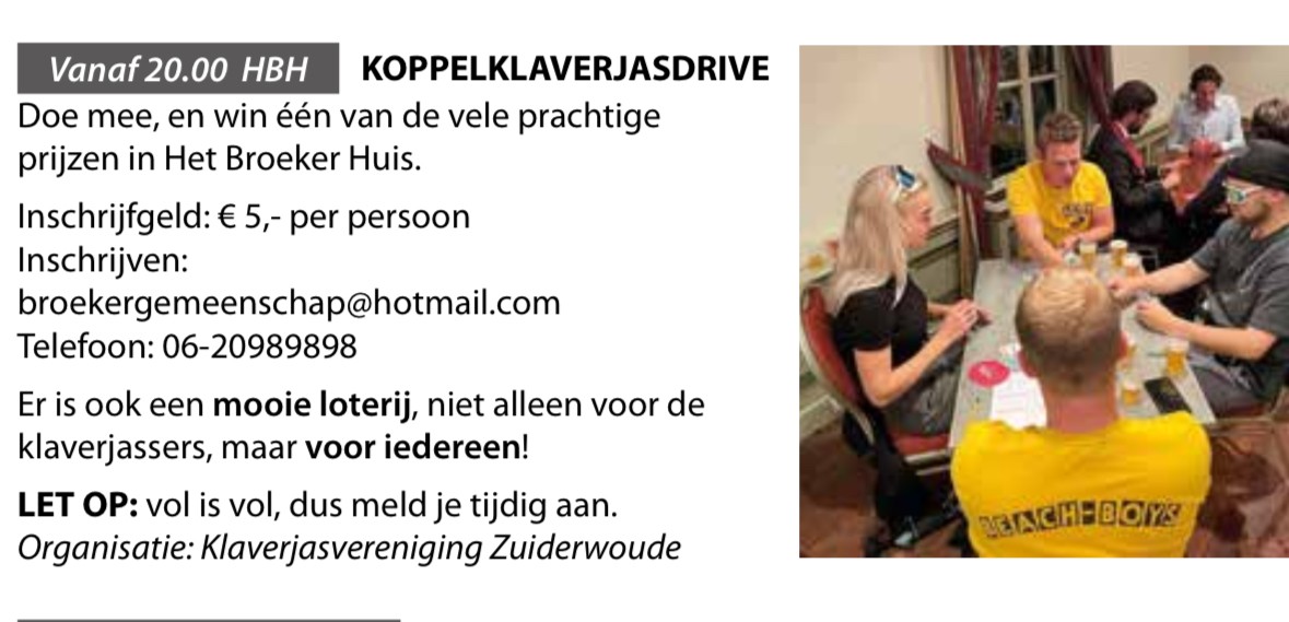 Doe mee en win een van de prachtige prijzen.Deze jaarlijks terugkomende koppelklaverjasdrive is altijd erg gezellig en goed bezocht. Er is ook nog een mooi loterij deze avond, dit is niet alleen voor de klaverjassers, maar voor iedereen.