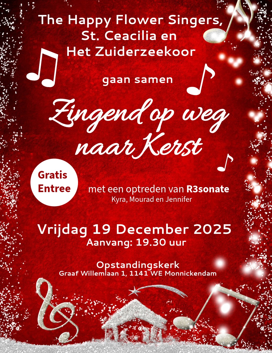 Drie koren zingen gezamenlijk meerstemmige populaire en bekende kerstliederen en er is ook gelegenheid om gezellig mee te zingen.