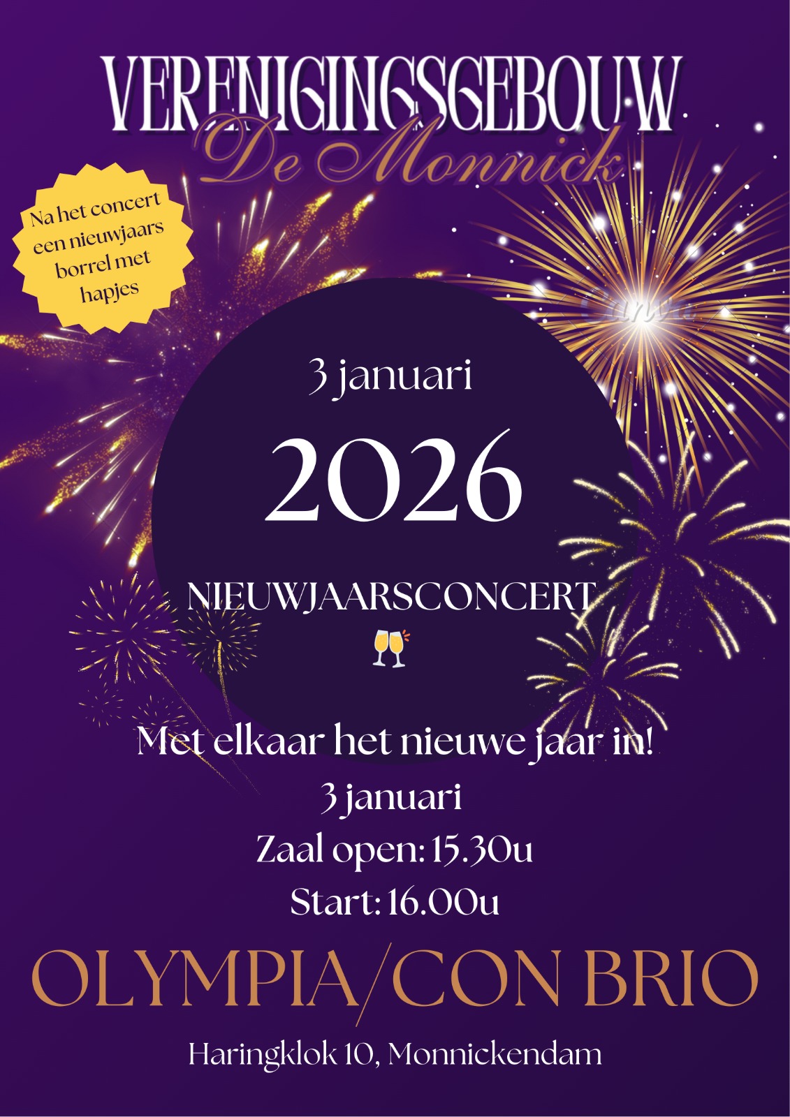 Na het succes van vorig jaar is er ook dit jaar weer een nieuwjaarsconcert met nieuwjaarsborrel in Verenigingsgebouw de Monnick. De muzikale omlijsting wordt verzorgd door muziekvereniging Olympia / Con Brio.