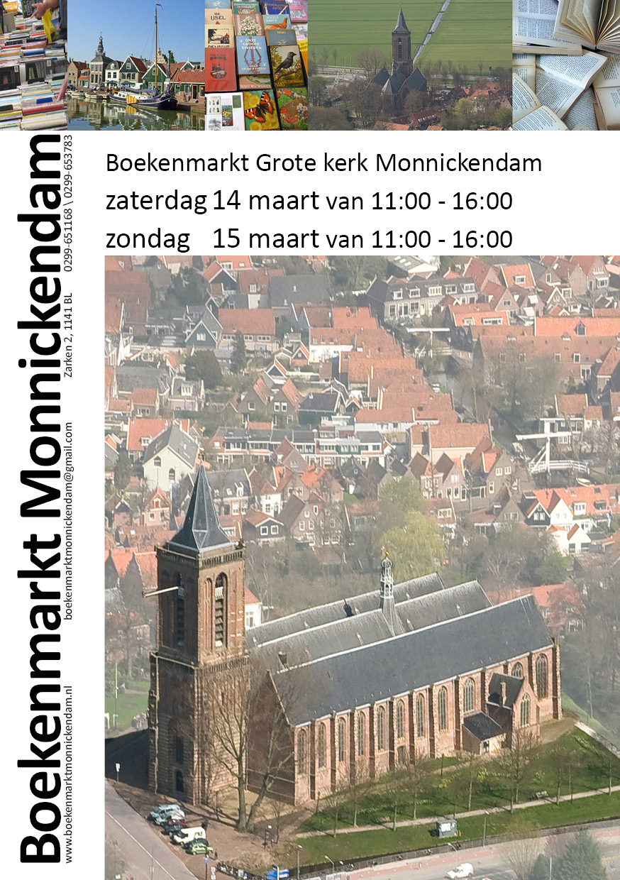 Zaterdag 14 maart en Zondag 15 maart wordt er een Kleine Boekenmarkt gehouden in de Grote Kerk Monnickendam. Toegang is gratis. Het gebouw is rolstoelvriendelijk en tegenover de kerk ligt een ruim parkeerterrein.