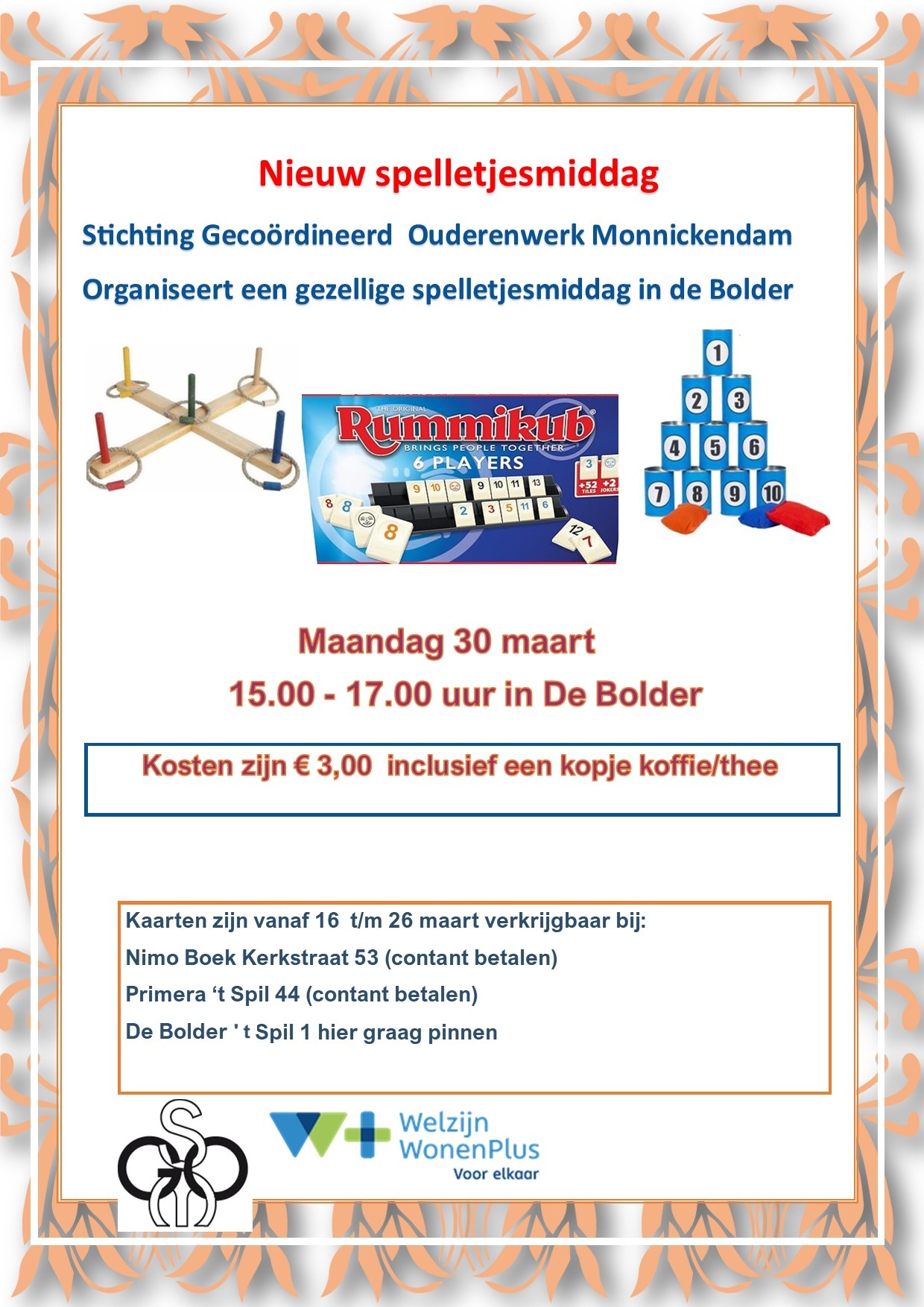 Een gezellige spelletjesmiddag met verschillende bordspelen maar ook behendigheidspelen zoals blikgooien, ringgooien etc.Kopje koffie/thee is inclsief de entree.
